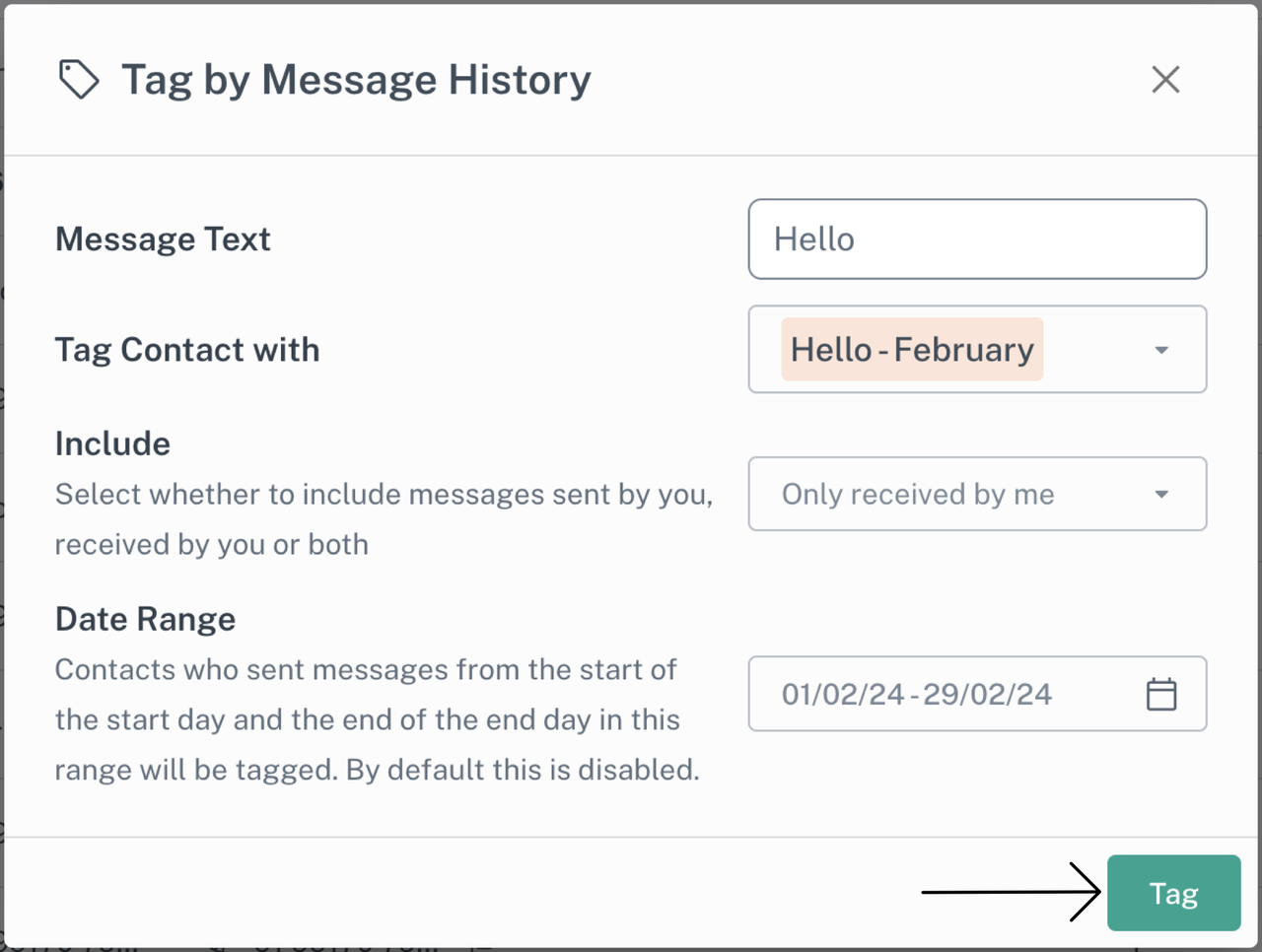 - Select a relevant tag from the existing list or create a new tag to categorize the contacts.