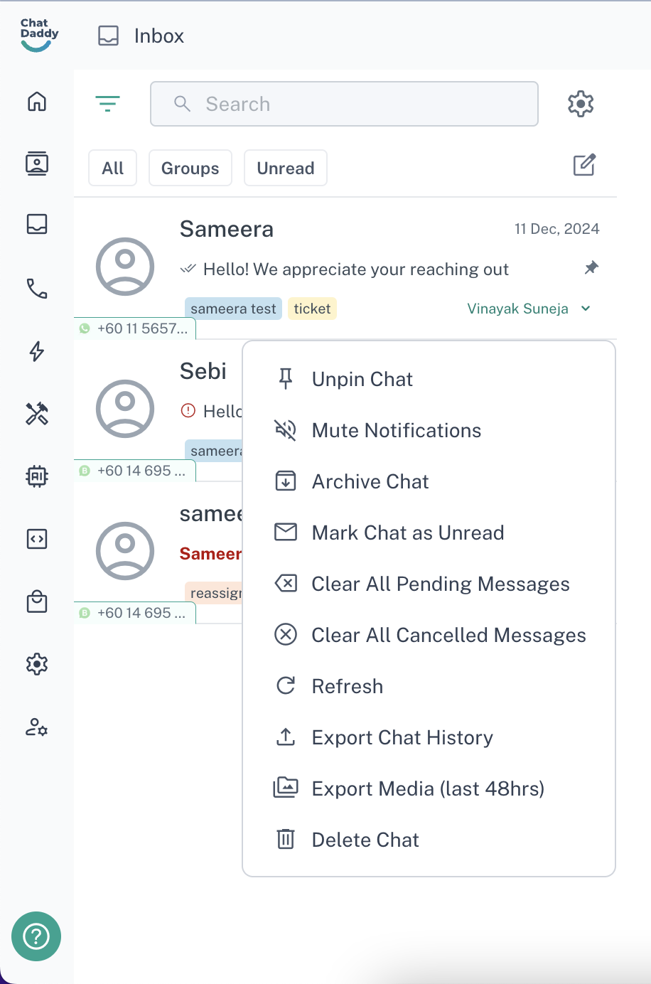- Mark as Unread: Resets the chat’s status, marking it as unread and highlighting it as a new message in your inbox.