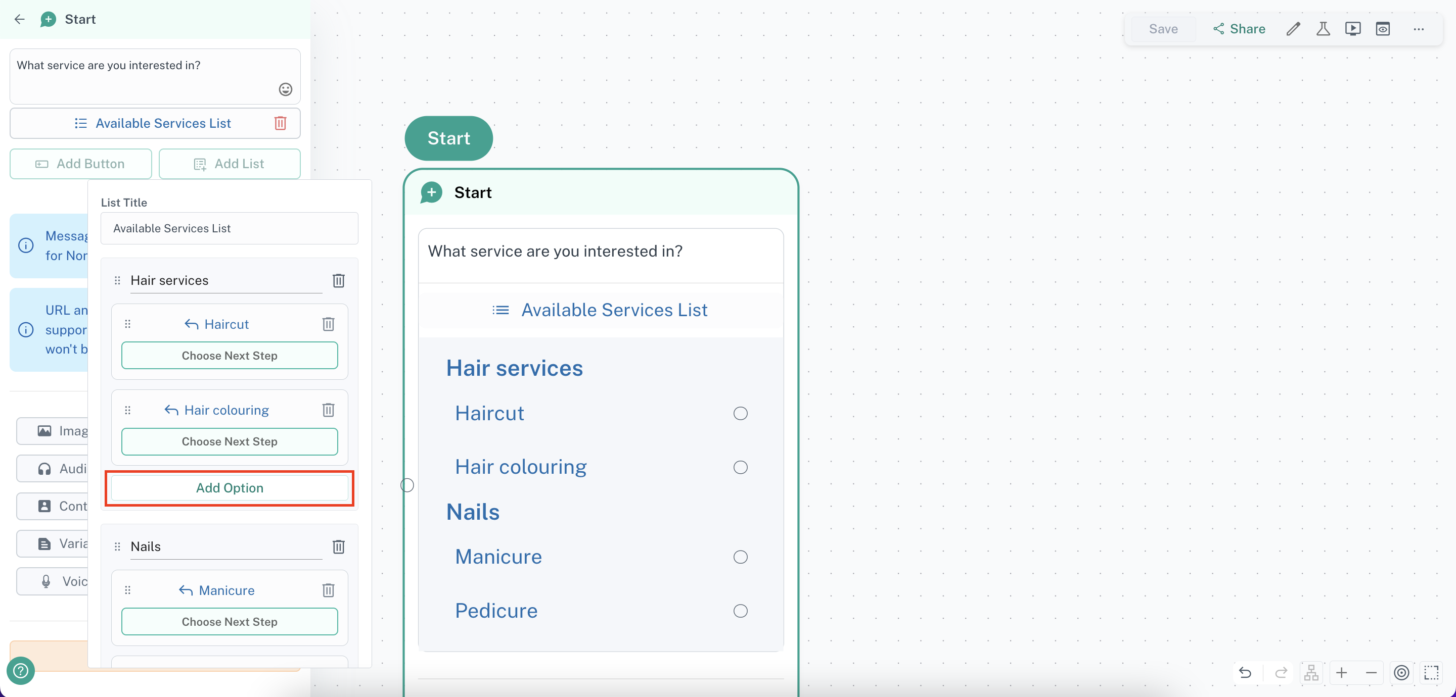 Lists include a menu of up to 10 options, offering a clean and consistent way for users to select an item when interacting with your business.